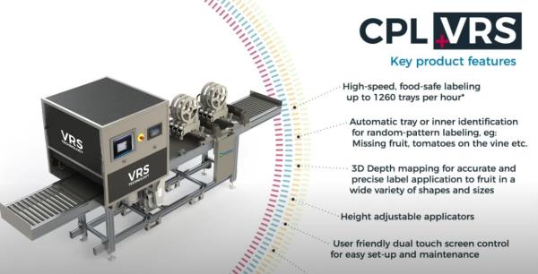 VRS, le système de reconnaissance visuelle augmente la précision de l'étiquetage, il localise intelligemment le produit et l'étiquette est appliquée dans la position optimale. Cette technologie offre également des options d'étiquetage avancées qui permettent une plus grande flexibilité dans la manière dont les entreprises d'emballage peuvent étiqueter. Un autre avantage est la fonction de masquage des plateaux qui permet à l'utilisateur de choisir les produits à étiqueter dans un plateau. Le VRS peut être utilisé pour n'importe quelle forme de fruit. ajoute Duncan Jones : "Le VRS est particulièrement utile pour l'étiquetage de produits placés au hasard, comme les tomates en grappe ou les poires ".